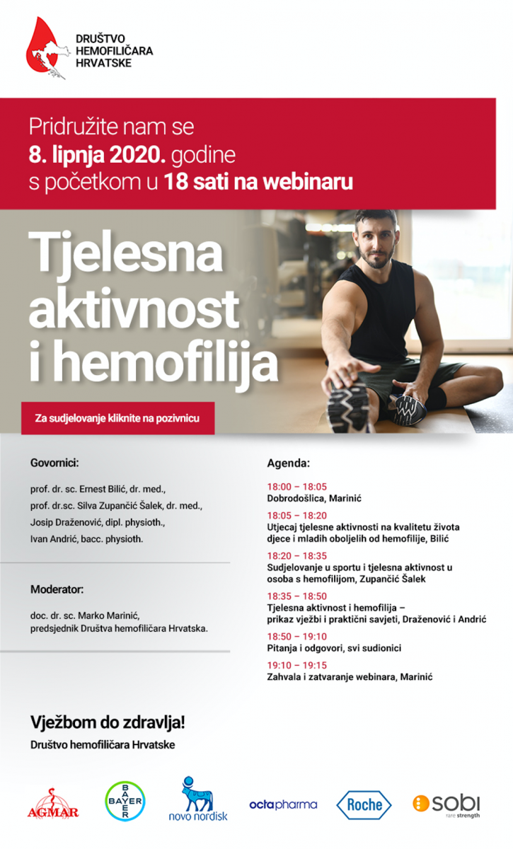 Tema je vrlo aktualna, posebno u ovom nesretnom vremenu karantena, izolacija i dugotrajnog boravka u vlastitom domu. Naši eksperti obraditi će temu webinara i s aspekta djece i odraslih osoba s hemofilijom. Napravljen je i jedan video materijal koji će pokazati neke od konkretnih vježbi te dati niz praktičnih savjeta kako vježbati, kako održavati tjelesnu aktivnost i kondiciju, a pri tome ostati unutar dozvoljenih okvira da se izbjegne krvarenje ili dodatna ozljeda. Postojati će mogućnost postavljanja konkretnih pitanja svim panelistima izravnim audio-video uključenjem u webinar ili pisanim putem kroz dostupnu chat formu.